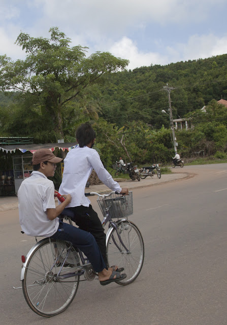 My husband made my bike for me. It has a stainless steel fuji absolute frame from the 80s, but we took all the logos and color off, and painted it taupe. I wanted a boring bike in contrast to the trendy bikes that are really flashy; I don't like my front wheel though. We could have gotten good money reselling it to hipsters, but I needed a replacement wheel, didn't want to buy another one, and this was the extra we had. Now it's all scratched up because of my brake. The velocity sticker is still there though. Maybe they'll think it's like that on purpose.